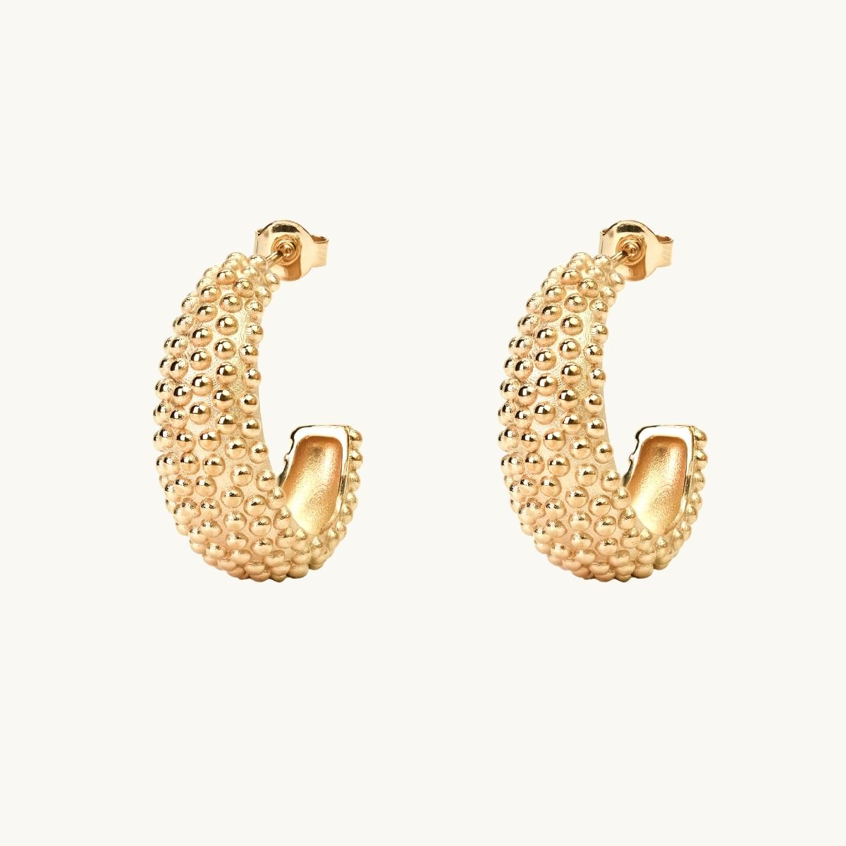 Örhängen som inspirerats av morgondagg, med små droppar längs med hela örhänget. Kontrasten mellan den matta ytan och de högpolerade dropparna, skapar ett vackert gnistrande skimmer.